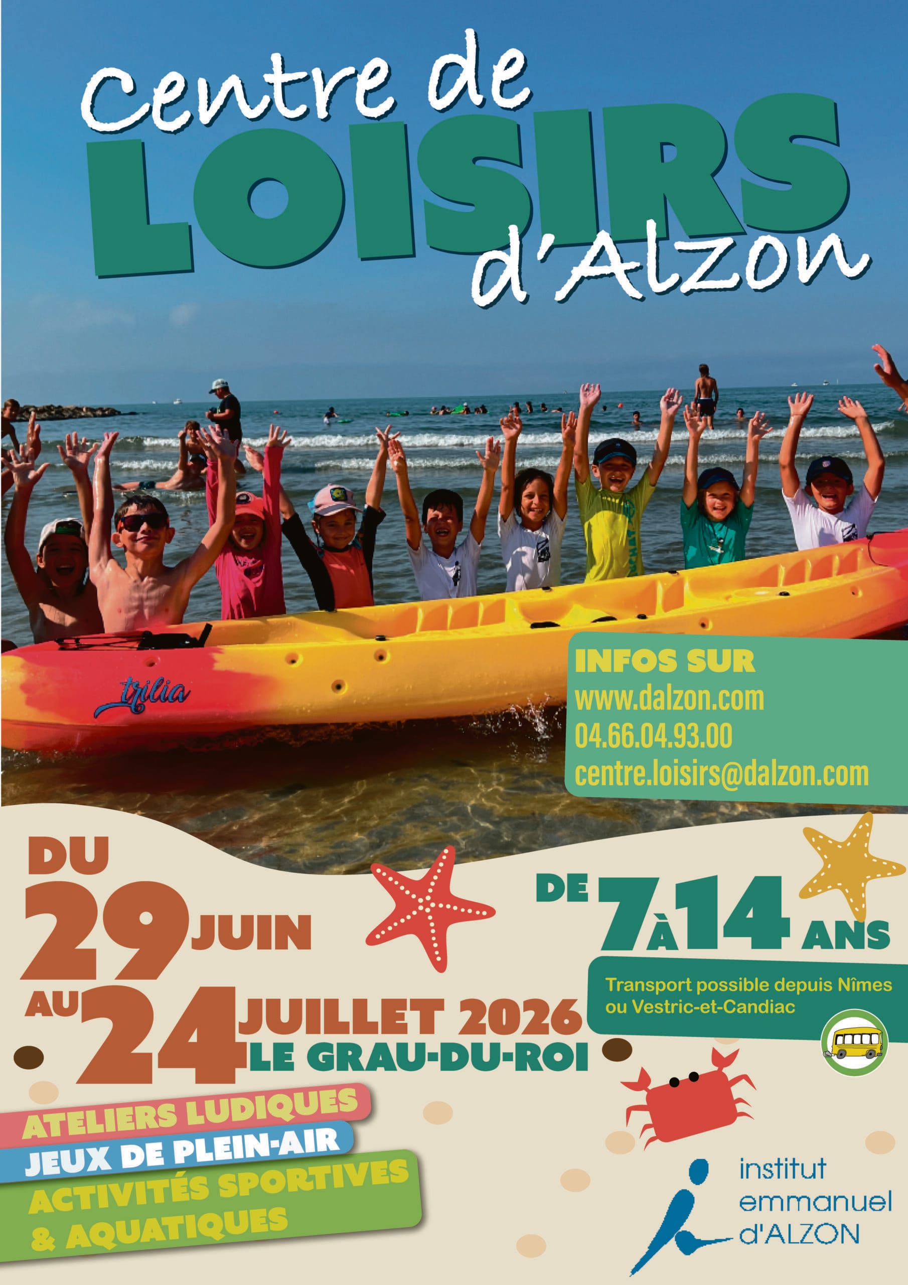 Ouvert à tous de 7 à 14 ans, centre de loisirs équipé, en bord de mer sur la plage tranquille du Boucanet et dans les agréables locaux de l’école d’Alzon Le Grau-du-Roi.