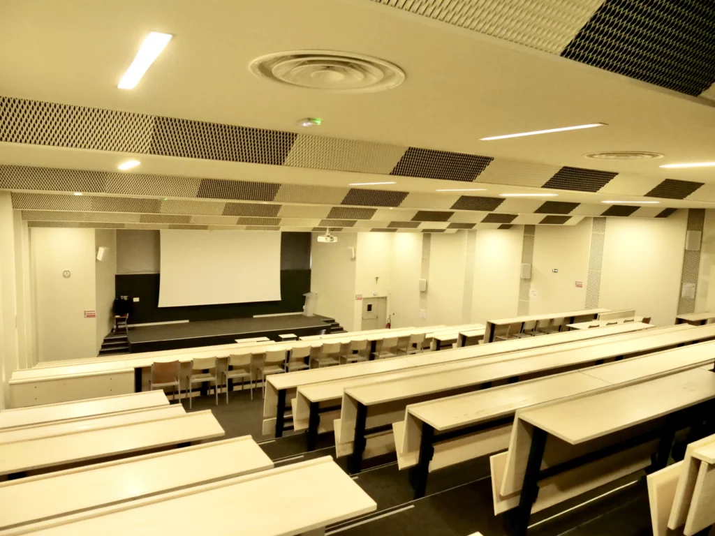 3 amphithéâtres, modulables de 150 à 400 places assises. Les amphithéâtres sont équipés de matériels audio (micro, sono etc), ainsi que d’un vidéo projecteur.